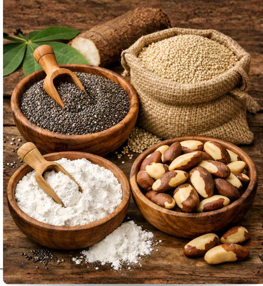 We supply certified superfoods and functional ingredients including chia seeds, Brazil nuts (Amazonian chestnuts), cassava starch, and Andean grains like quinoa, available in both organic and conventional grades.